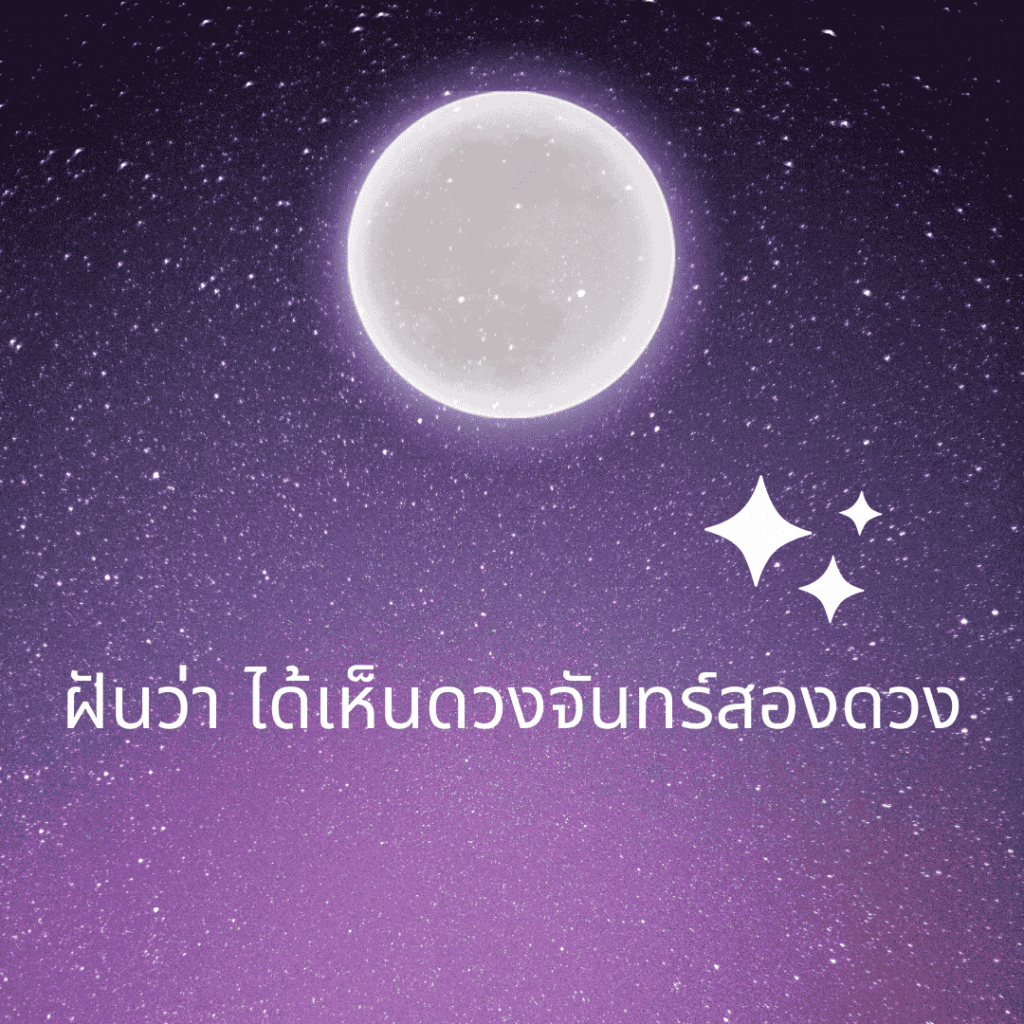 ฝันว่า ได้เห็นดวงจันทร์สองดวง ทำนายว่า ชีวิตช่วงนี้สุดจะมีความสุข ไม่ต้องกังวลหรือทุกข์ใจ จะลงทุนก็รุ่ง อ้อสำหรับใครที่มีลูกหนี้ที่หยิบยืมไปนาน จนคิดว่าจะไม่ได้คืน ก็เตรียมตัวได้รับเงินคืนแบบฟลุ๊ค ๆ ด้วย