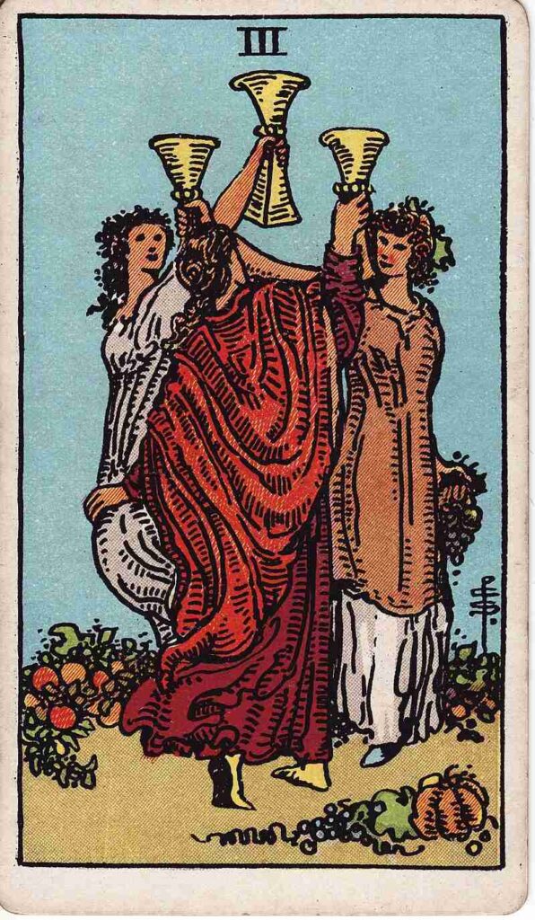 ไพ่ 3 ถ้วย หมายถึง การพบปะสังสรรค์กับเพื่อนฝูง ความเข้าใจกัน ความสุขหลังจากได้ร่วมงานกัน อีกนัยหนึ่งหมายถึง การรวมสิ่งต่าง ๆ เข้าด้วยกันเพื่อสร้างสรรค์สิ่งใหม่